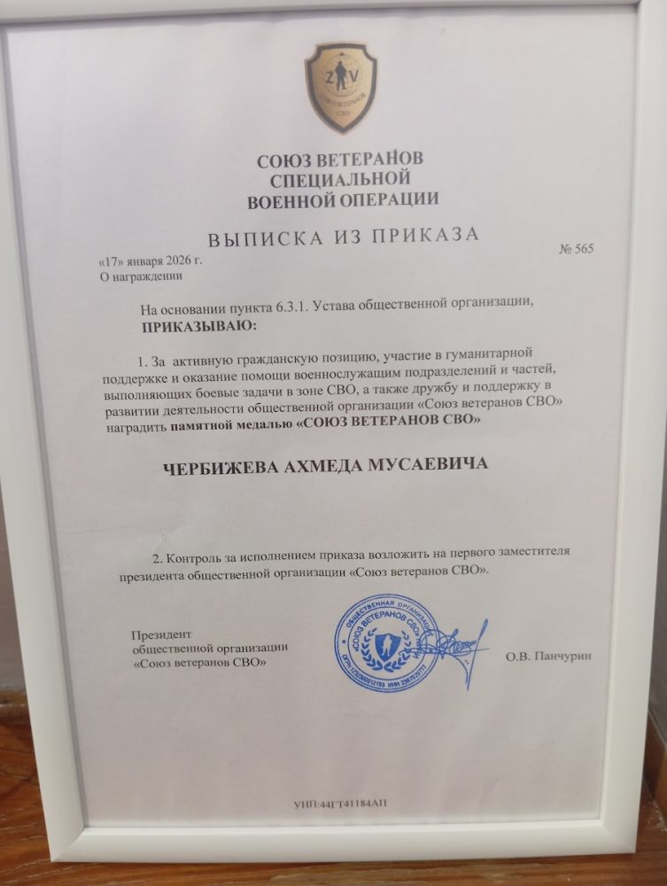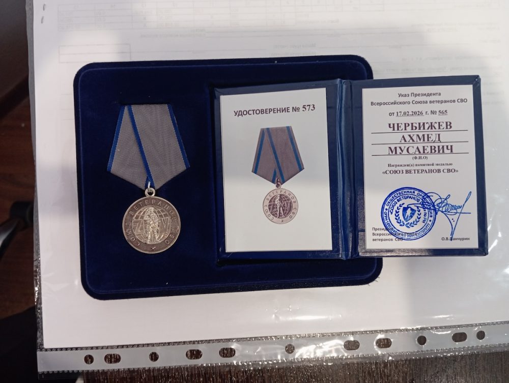 Председатель Контрольно-счетной палаты Муниципального образования «Городской округ город Магас» Чербижев Ахмед Мусаевич награжден памятной медалью «СОЮЗ ВЕТЕРАНОВ СВО» Президентом общественной организации «Союз ветеранов СВО» О.В.Панчуриным за участие в гуманитарной поддержке и оказание помощи военнослужащим подразделений и частей, выполняющих боевые задачи в зоне проведения СВО, а также за дружбу и поддержку в развитии деятельности общественной организации. Приказ №565 от 17.01.2026г. удостоверение №573.
